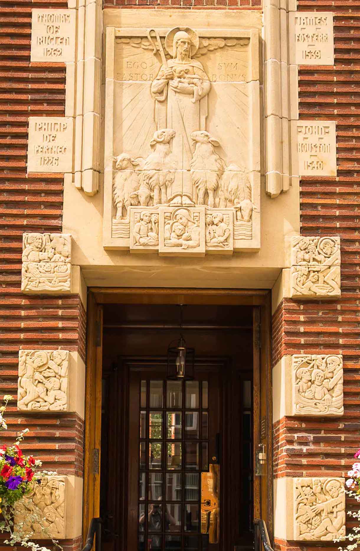 The 1940 building is distinctive in scale and design.  The front exterior shows the sculpted figures of Jesus and the four Evangelists, together with the dove of the Holy Spirit.  St Columba and his monk companions are displayed in bas relief above the doors.