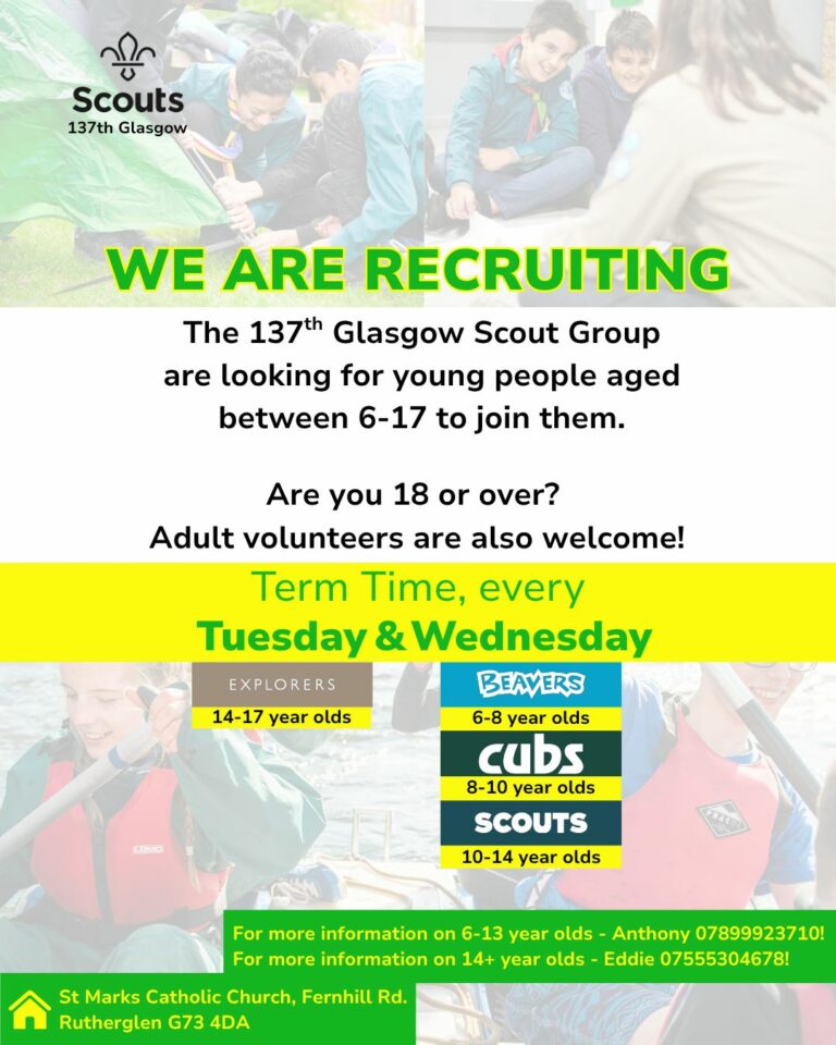 The 137th Glasgow Scout Group for young people runs on Tuesday & Wednesday evenings in St Mark’s Parish Hall. Group times are:Â