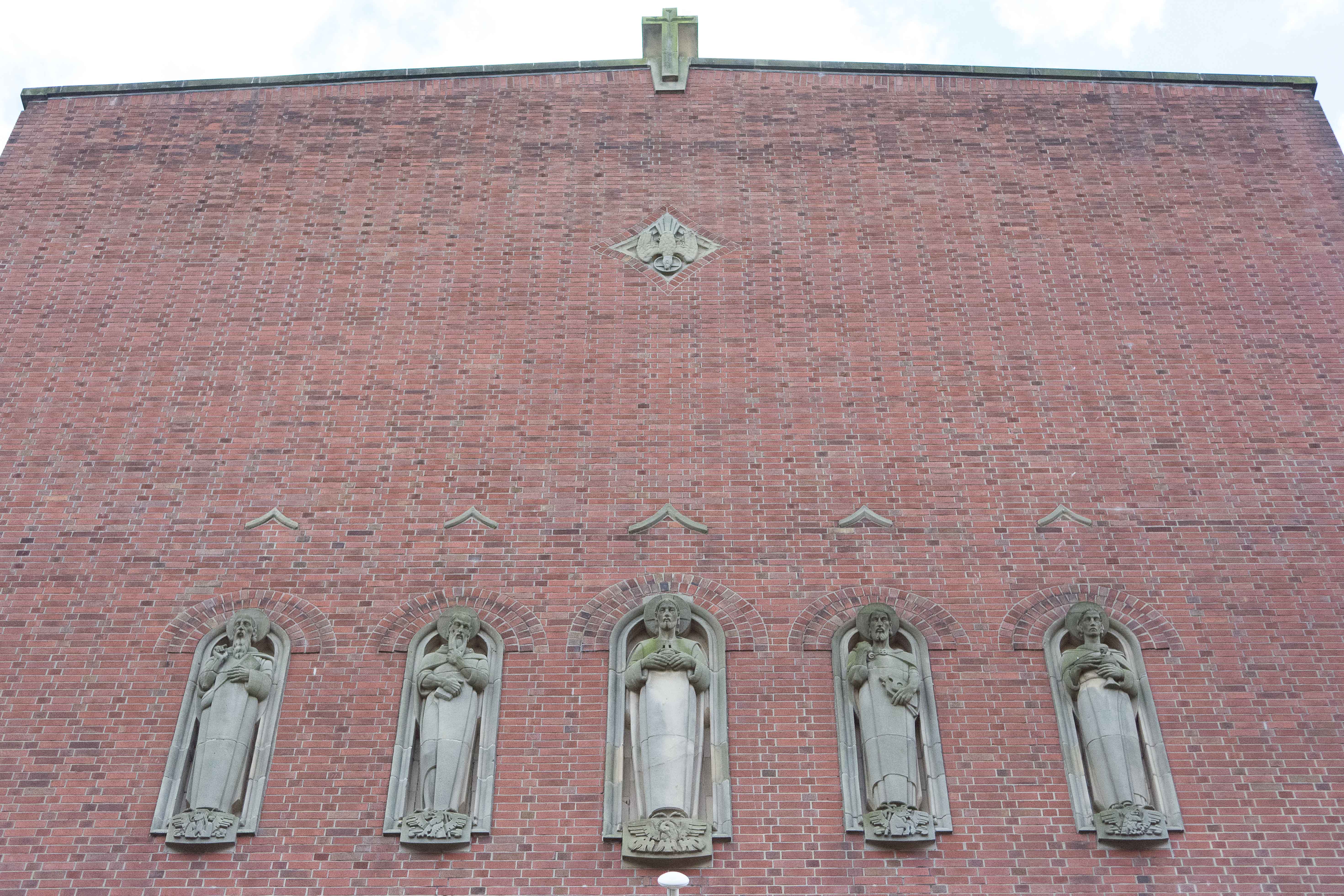The front exterior shows the sculpted figures of Jesus and the four Evangelists, together with the dove of the Holy Spirit. Â St Columba and his monk companions are displayed in bas relief above the doors.
