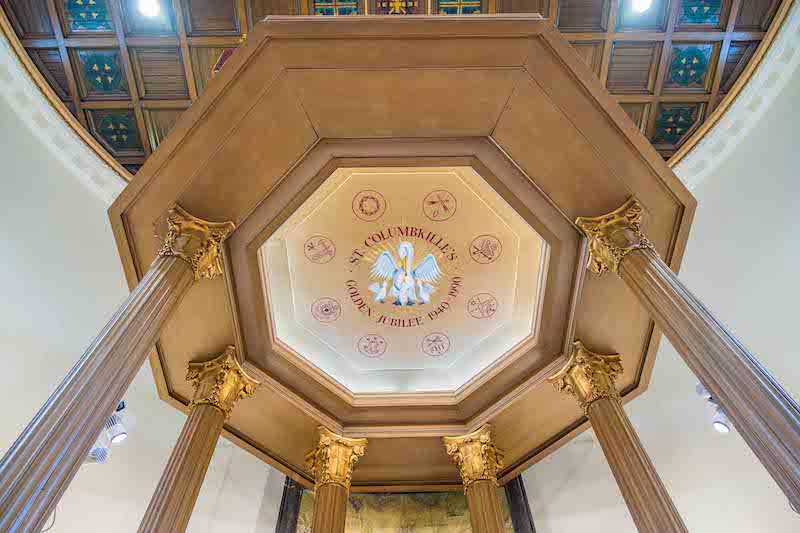 Mr. Crosbie described how, in his work on the ceiling of the Lady Chapel, he depicts eight aspects of Our Lady’s life, from her Presentation in the Temple to her Coronation in Heaven. ” A ground of metal foil was first laid to secure protection from plaster reactions. Superimposed is an oil painting applied in the late Renaissance technical manner, involving solid and glazed painting with gilding and final drawing, giving the maximum solidity and durability without having to employ the fullest range of tone, avoiding undue heaviness, the final stage being a sealing of varnish to withstand atmospheric contamination.”