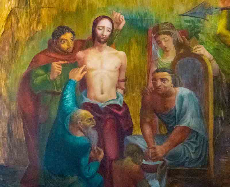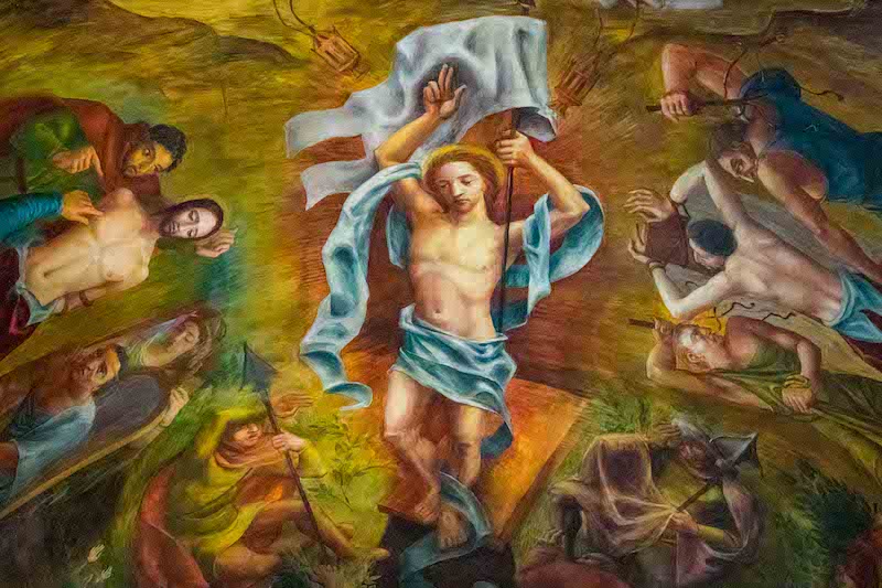 Mr. Pritchard, in an account of his work in the Sacred Heart Chapel, says that his subject is the Agony, Crucifixion and Resurrection of Our Lord. “The colour scheme is based on the liturgical colours of the Sacred Heart, red and gold, and from the glowing figure of the resurrected Christ which dominates the crown of the vault, the colour deepens to darker and more sombre tones in the various events of the Passion which are depicted in the spandrels between the arches. The spire of the vault shows the risen Christ carrying the banner of the ResurrecÂtion. His grave clothes are falling from His glorified Body back into the tomb; the guards are stricken with terror. The painting is executed in glazed oil-paint on an aluminium-leaf ground, the metallic lustre of the aluminium giving a rich glow to the thinly applied layers of colour.”