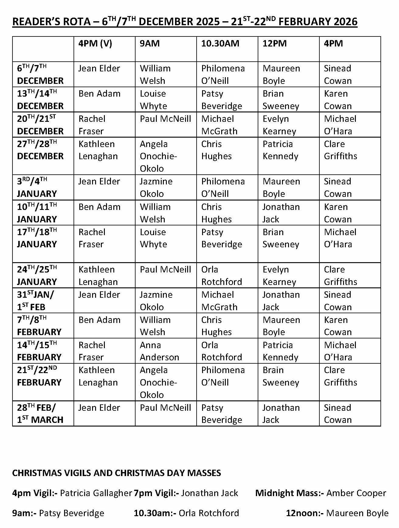 Readers' Rota (Dec.25 - Feb.26)Please see below the latest rota which covers December 2025 to February 2026, including Christmas. As always, the rota will follow on WhatsApp and will be post on the porch noticeboard. Previous Post Arranging a Baptism Next Post 1st Sunday in Advent (Year A)