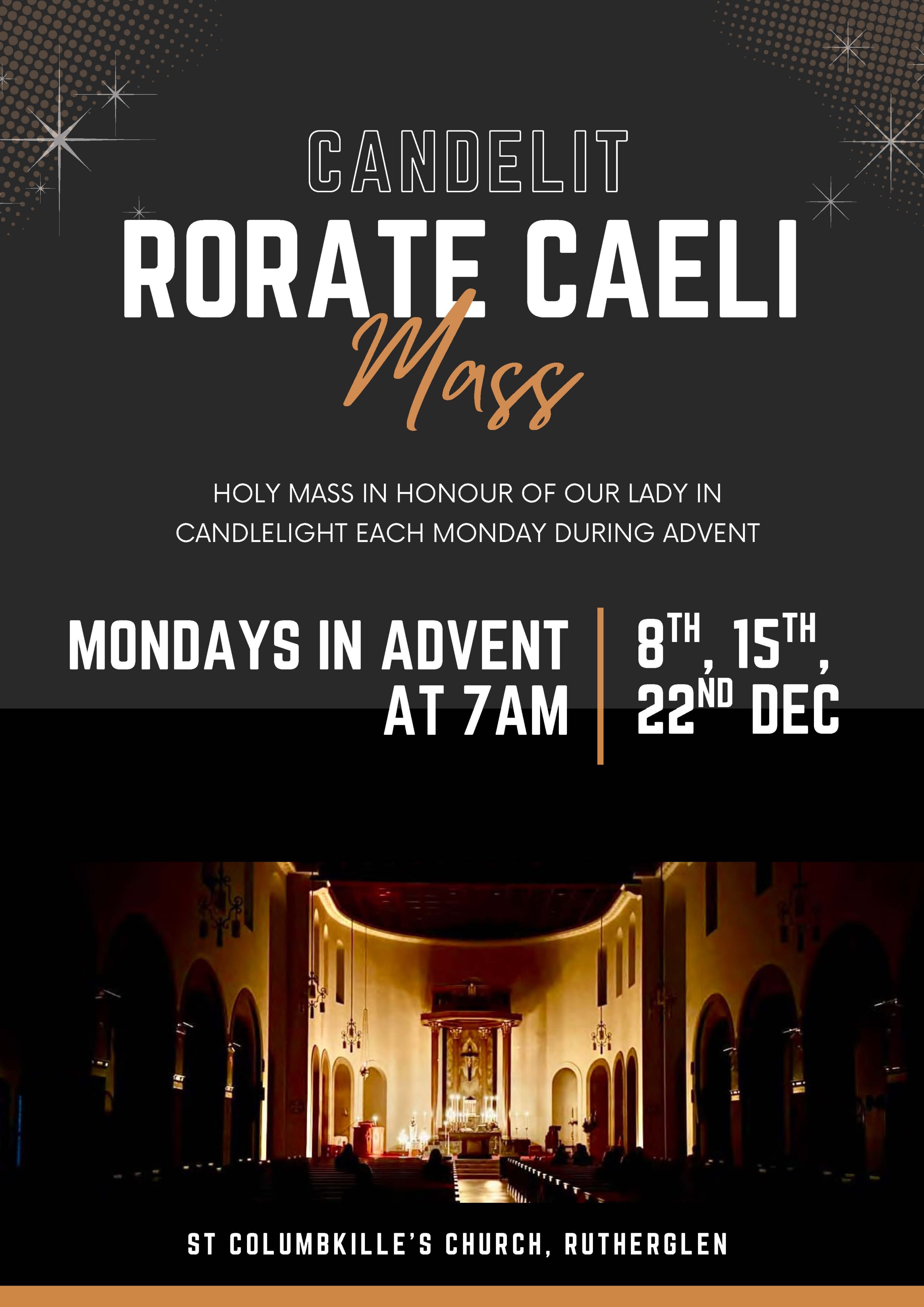 The Rorate Caeli Mass is a traditional Advent devotion where Mass is offered, in darkness just before dawn, in honour of the Blessed Virgin Mary. The church lighting will be dimmed for these Masses.
